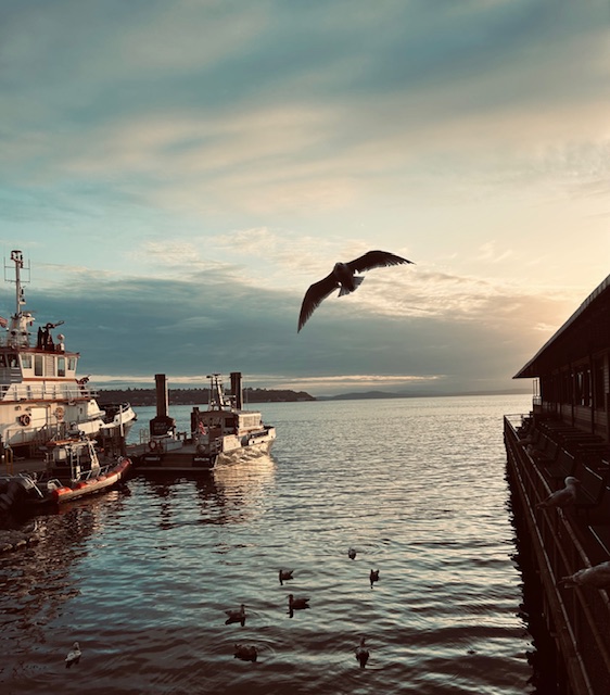 This is the time to be fully present before starting my day. I take in the air, which is sometimes thick with rain, or thin with summer heat or piercing with cold. I blow it out and my phone stays in my pocket. I notice the state of the trees – sometimes full of leaves of green or red and yellow and other times, like today, naked with bejeweled rain drop branches. The geese may be around, or maybe just some ducks. The water below is clear and calm or filled with birds or a perfect reflection of the sky or full of the force of raindrops and wind. I notice my mind. It is calm. I feel the radiant energy of Earth.