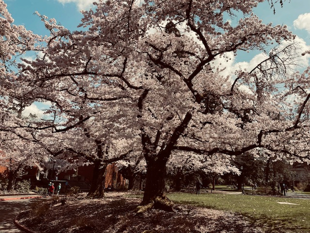 The air is warm and full of plum tree petals. I am taking a circular walk around and around the blocks of my son’s elementary school. My headphones are in, the sky is bright and my mind consumed by a storyteller. In the middle of my second lap I realize that there is a person walking on the sidewalk about a half of a block behind me, neither gaining nor retreating and definitely not walking a dog. I notice myself noticing them. What is that feeling? It is familiar. I turn around and do a double take because it is him. He sees me see him and calls my name. I turn back around and yell,
